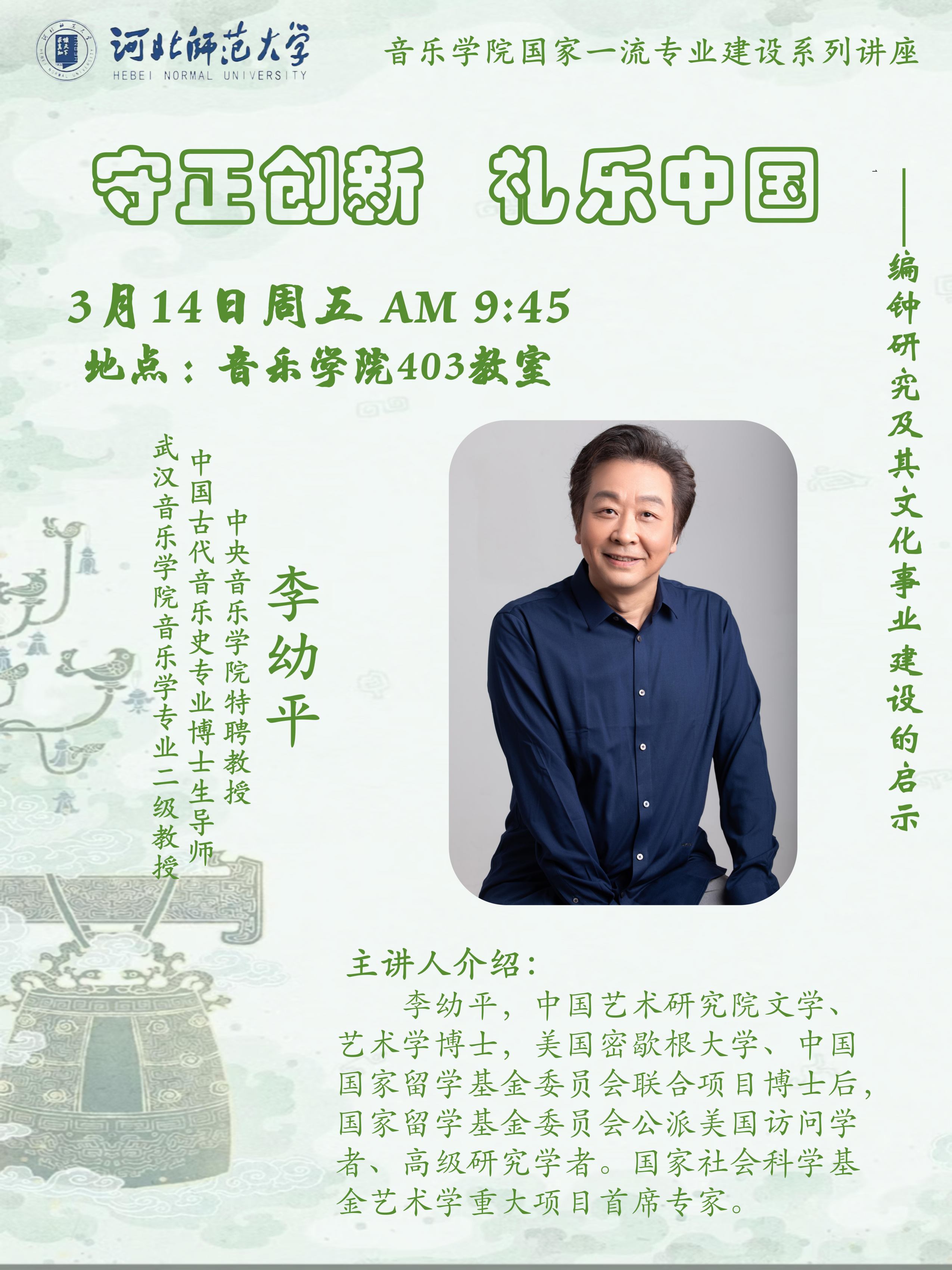 李幼平,中国艺术研究院文学•艺术学博士,美国密歇根大学、中国国家留学基金委员会联合项目博士后,国家留学基金委员会公派美国访问学者、高级研究学者。中央久久小说 特聘教授、中国古代音乐史专业博士生导师、博士后项目合作导师、国家社会科学基金艺术学重大项目首席专家,武汉久久小说 音乐学专业二级教授、党委原常委副校长。教育部高等学校音乐与舞蹈学类专业教学指导委员会副主任委员、本科教育教学质量审核评估专家,普通高校音乐专业教学质量国家标准、中国学生音乐学科核心素养等项目核心组成员。国家社会科学基金艺术学重大项目“礼乐文化传承创新的当代音乐实践与理论研究”、国家文化创新工程项目“新编钟科技成果转化与推广”、国家艺术科学规划领导小组办公室委托项目“艺术学•音乐学科十年(2012-2021)发展研究”及钟磬礼乐、大晟钟与宋代黄钟标准音高研究等国家级、省部级和中美国际合作项目负责人,研究成果曾获文化部科学技术进步奖、湖北省科学技术进步奖、邓广铭学术奖励基金著作奖及国家专利。