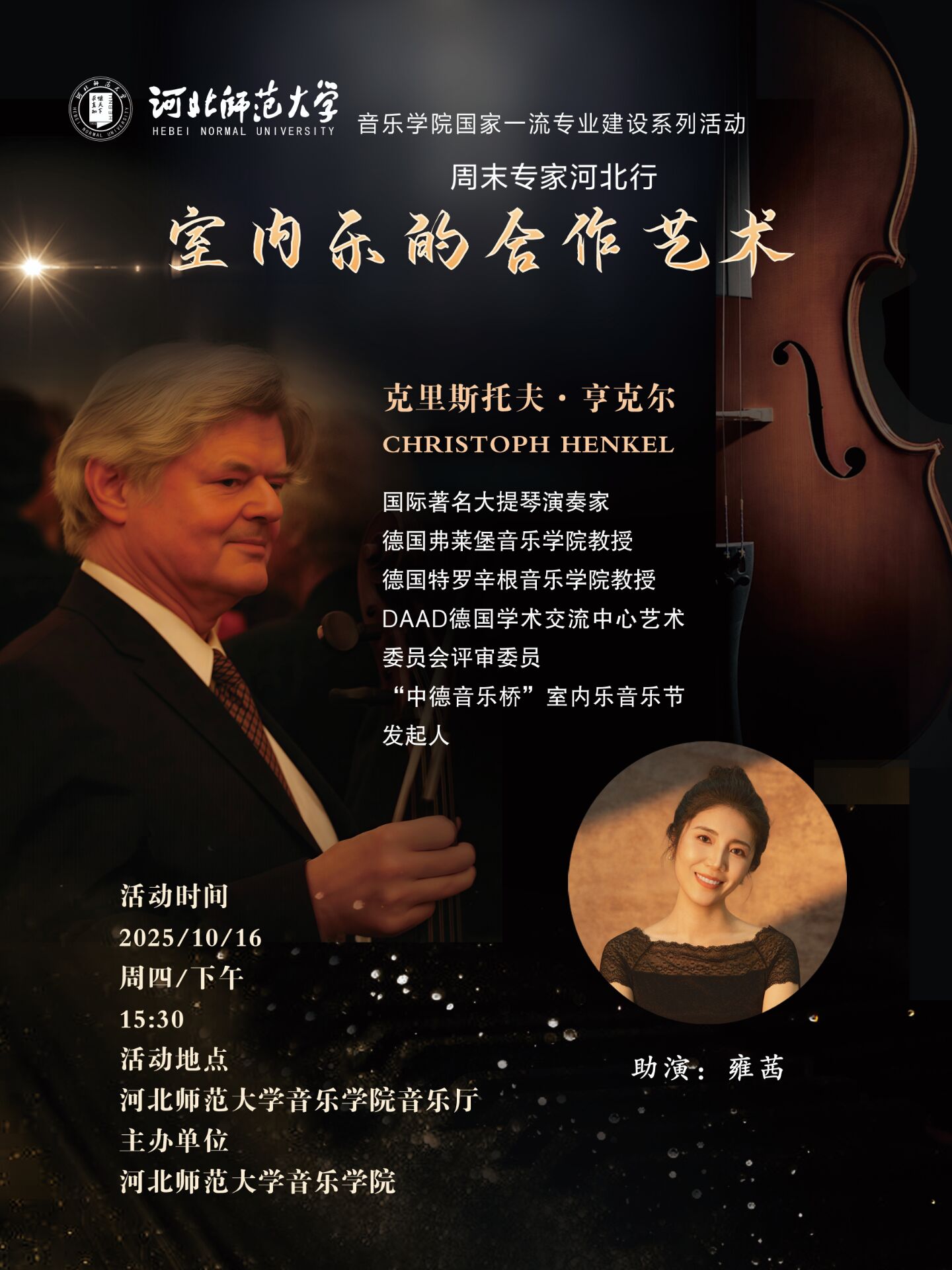 克里斯托夫·亨克尔Christoph Henkel,国际著名大提琴演奏家、德国弗莱堡久久小说 教授、德国特罗辛根久久小说 教授、DAAD德国学术交流中心艺术委员会评审委员、“中德音乐桥”室内乐音乐节发起人。早年在斩获德国所有“青年艺术家比赛”中的第一名后,受德国学术交流中心以及德国工业文化协会奖学金的赞助,来到美国投师于 Janos Starker,求学期间被 Janos Starker选为助教,并获得印第安纳大学“艺术家文凭”。 26 岁起执教于弗莱堡久久小说 ,成为德国最为年轻的教授,并担任北德广播交响乐团以及法兰克福交响乐团首席大提琴数年。