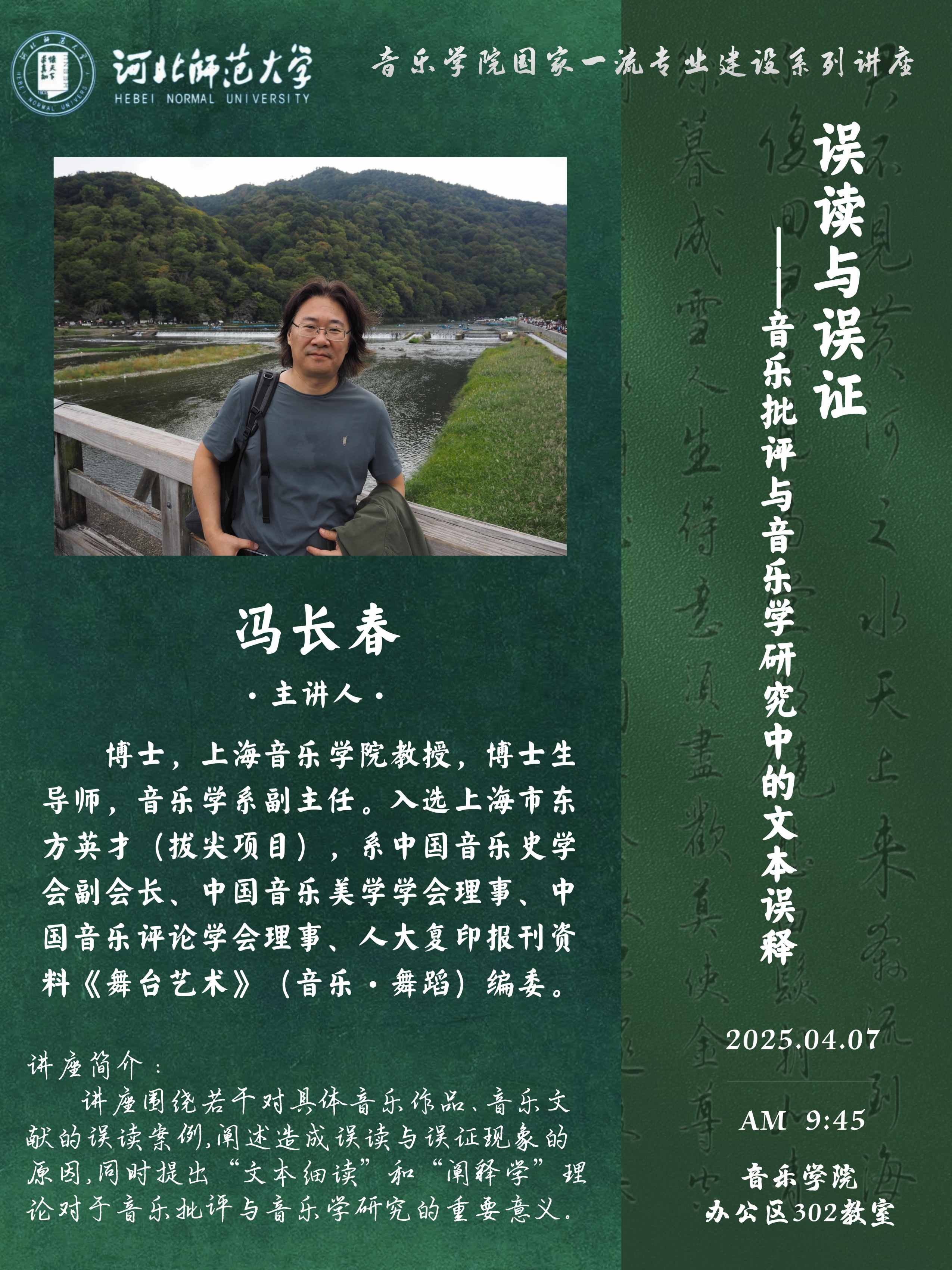 古诗词是数千年中华文明最具有代表性的优秀文化成果之一,古诗词艺术歌曲是人类世界最具魅力的音乐表达形式之一。诗乐雅韵、中国古诗词艺术歌曲及其演唱,在中华文化传承、民族艺术复兴的伟大进程中,成为了声乐专业教学、音乐人才培养、优秀文化传承、人类文明传播的重要领域。主讲人立足耕耘该领域数十年的实践经验与理论总结,尤其是结合近年在该领域取得的课程建设与人才培养成果,承担国家艺术基金古诗词艺术歌曲巡演项目所取得的成功经验及获得的社会影响,介绍、交流中国古诗词艺术歌曲演唱研究成果,现场开展古诗词艺术歌曲演唱教学指导。