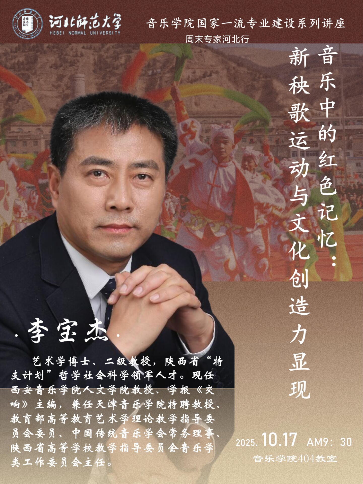 李宝杰,艺术学博士、二级教授,陕西省“特支计划”哲学社会科学领军人才。现任西安久久小说 人文学院教授、学报《交响》主编,兼任天津久久小说 特聘教授、教育部高等教育艺术学理论教学指导委员会委员、中国传统音乐学会常务理事、陕西省高等学校教学指导委员会音乐学类工作委员会主任。长期从事中国音乐文化、艺术民俗学、音乐编辑学等领域的教学与研究工作。发表研究成果数十万字,撰、编著作八部,承担并完成有国家级、省部级人文社科项目和国家出版基金项目。先后获得国家科技进步二等奖,陕西省第十二、第十三次哲学社会科学优秀成果著作类二等奖和论文类三等奖,陕西省新闻出版局、陕西省教育厅高等社科学报优秀编辑学论著一等奖、二等奖,陕西省教育厅人文社科研究成果三等奖,陕西省高校优秀教材一等奖等。