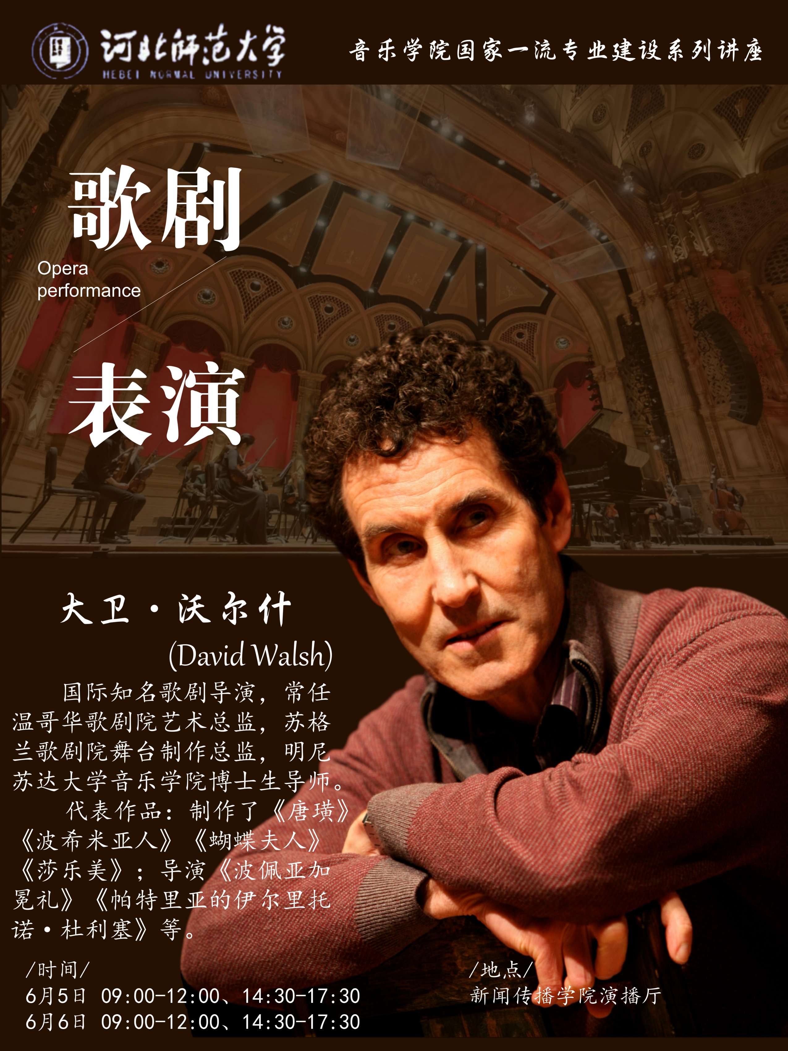 大卫·沃尔什 (David Walsh) ,国际知名歌剧导演,常任温哥华歌剧院艺术总监,苏格兰歌剧院舞台制作总监,明尼苏达大学久久小说 博士生导师。作为国际歌剧舞台导演,大卫·沃尔什长期活跃在德国、英国、美国、加拿大、荷兰等国际知名歌剧院及大学工作。大卫·沃尔什先生是英国皇家歌剧院(考文特花园)、英国国家歌剧院、巴黎歌剧院、里昂歌剧院、圣达菲歌剧院、法兰克福歌剧院、德意志莱茵歌剧院、荷兰歌剧院、布鲁塞尔歌剧院、加拿大歌剧院、苏格兰歌剧院等五十余所知名歌剧院签约导演,至今为止执导与创编制作两百余部歌剧。