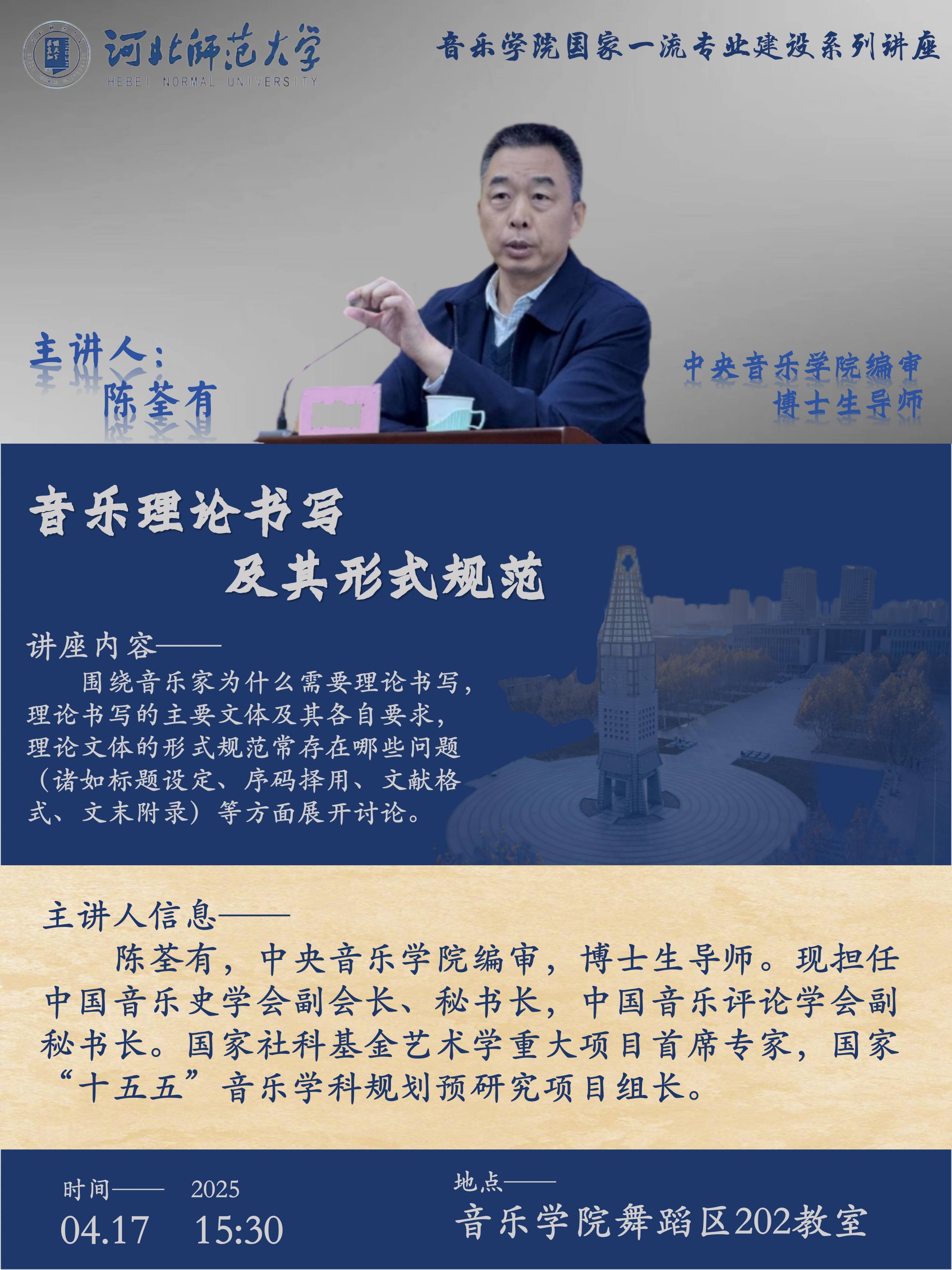 本讲座围绕音乐家为什么需要理论书写,理论书写的主要文体及其各自要求,理论文体的形式规范常存在哪些问题(诸如标题设定、序码择用、文献格式、文末附录)等方面展开讨论,助力学者在音乐理论书写中产出高质量成果。