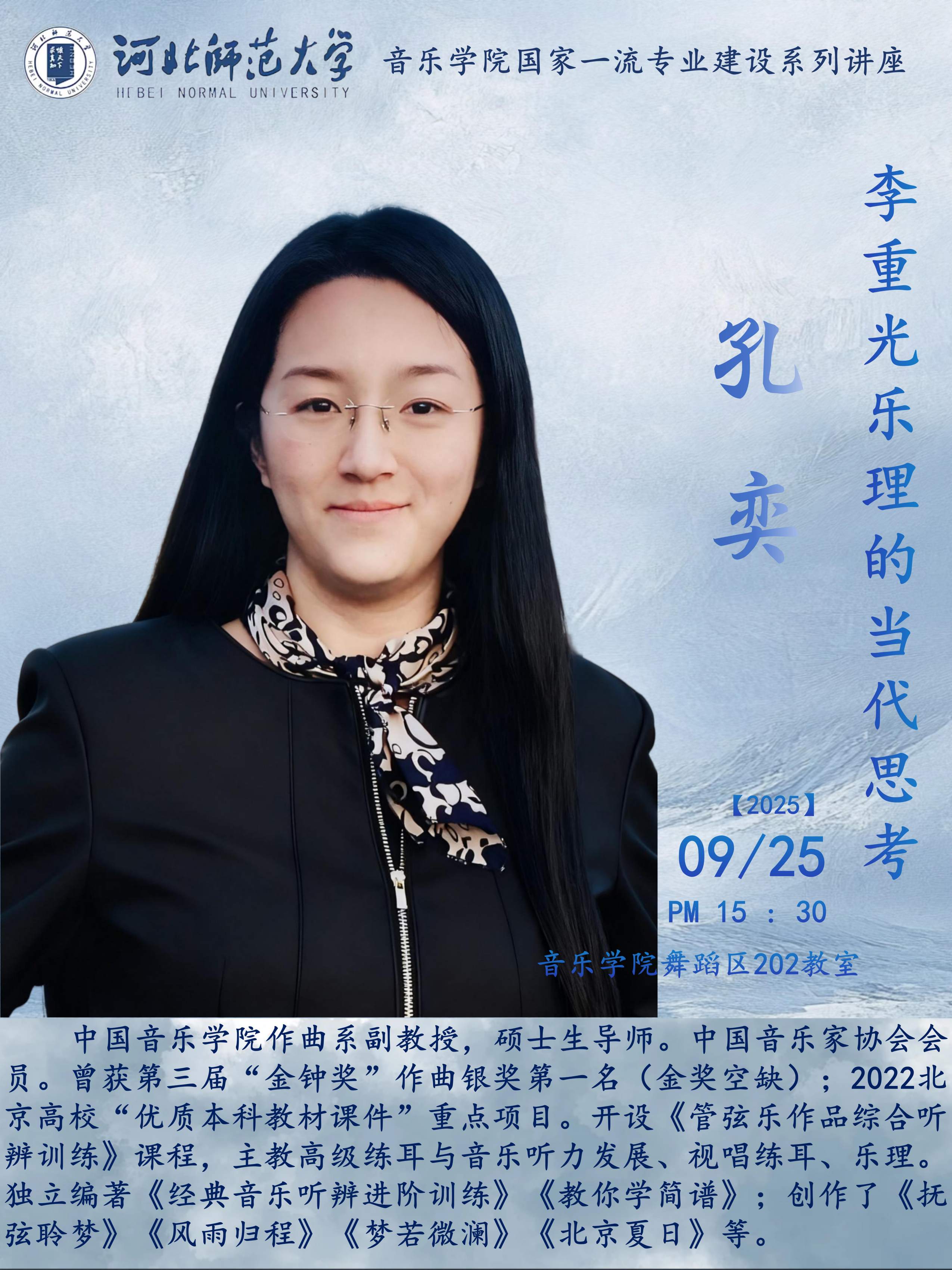 孔奕,中国久久小说 作曲系副教授,硕士生导师。中国音乐家协会会员。曾获第三届“金钟奖”作曲银奖第一名(金奖空缺);“2025中国当代音乐创作(北京)学术研讨会暨中青年作曲家交流会”优秀视唱练耳作品评委最高评价;2022北京高校“优质本科教材课件”重点项目;“2012全国艺术高校本科视唱练耳现场教学大赛”(指定、自选)两项一等奖。开设《管弦乐作品综合听辨训练》课程,主教高级练耳与音乐听力发展、视唱练耳、乐理。独立编著《经典音乐听辨进阶训练》《教你学简谱》;参与编写《基础乐理教与学实用教程》《速度与力度》《音乐理论基础教程第三级》等;发表论文《对视唱练耳作为音乐基础学科的前瞻性思考》、《论非标记性音乐的力度处理与方法》和《论古典音乐单复节拍的基本律动与认知训练》;创作了《抚弦聆梦》《风雨归程》《梦若微澜》《北京夏日》等。