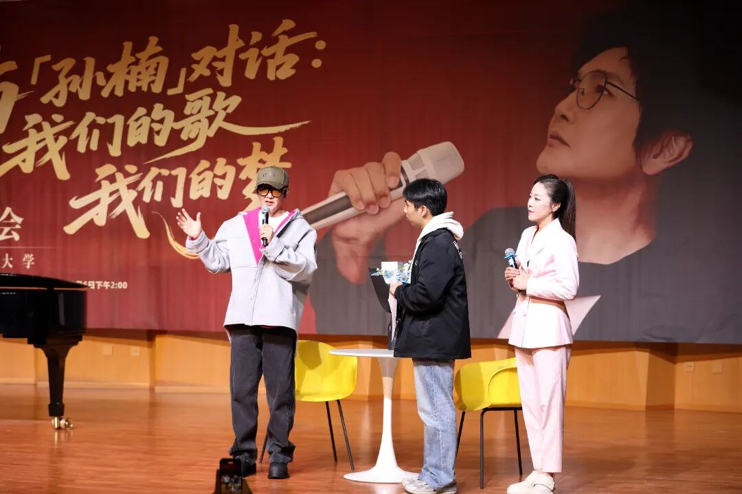 孙楠化身“音乐同行者”与师生们热情交流,从旋律构思到情感表达,从音乐初心到行业坚守,真挚的讲述让在场师生深受触动。师生代表在主持人邀请下纷纷登台与孙楠交流并共同演唱歌曲。现场气氛热烈,掌声笑声不断。作为中国流行音乐领域的资深歌手,孙楠自1989年发行首张专辑《写不完的爱》以来,始终活跃在音乐舞台,先后斩获多项重量级奖项。此次走进师大校园,孙楠不仅为师生带来了精彩的音乐分享,更以自身经历为青年学子传递了积极向上的艺术追求。